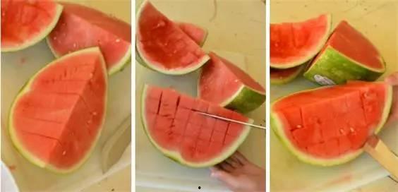 1. 西瓜切割:将西瓜放在案板上,用刀背轻轻拍打西瓜,使其裂开。用刀沿着西瓜的纹理切成两半,再用勺子挖出西瓜籽。接下来,将西瓜切成小块,就可以开吃了。